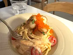 必食推薦! 意粉嘅軟硬度煮得啱啱好,al dente有咬口,我自己就好中意。明太子醬汁超級creamy,每一條意粉都掛滿濃郁嘅醬汁,鹹香鮮味喺口腔入面爆發出嚟。帆立貝大大粒,煎到表面金黃微焦,內裡保持嫩滑,好鮮甜!成個組合無可挑剔,明太子控絕對不能錯過啊。