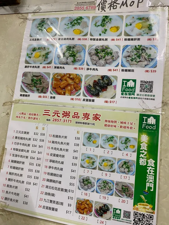 三元粥品專家 (新马路) 网址: https://s.openrice.com/QrLS1R5y000 地址: 澳門新馬路白眼塘橫街44號地舖 电话: +853 28573171