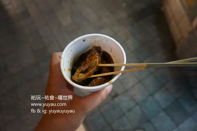每次到澳門三盞燈,除了要去吃緬甸椰汁雞麵或到地道的園林小食點吃碗牛肉魷魚粉絲,然後算吃到飽飽也要到附近的露天小攤檔去買一小杯豬腳姜吃。 這家豬腳姜營業時間不是太固定的,我大概每三次到三盞燈才會有一次碰到它在營業 (可能跟它不是太有緣份吧)。 平常吃到的豬腳薑的材料通常都是豬腳、薑及雞蛋,但在這店可吃到的還有豬皮、大腸及豬耳呢! 我當天就點了一串大腸及一隻薑醋蛋。老闆娘還用杯盛了些薑醋給我! 薑醋入口有點酸,質地濃稠,滿滿膠原蛋白的感覺。薑醋蛋大概在鍋中煮了很久,蛋白部份都變得硬硬的,咬下去質感跟鐵蛋很像。不過,若不喜歡煮得太硬的雞蛋的話可以跟老闆提出呀! 查看更多