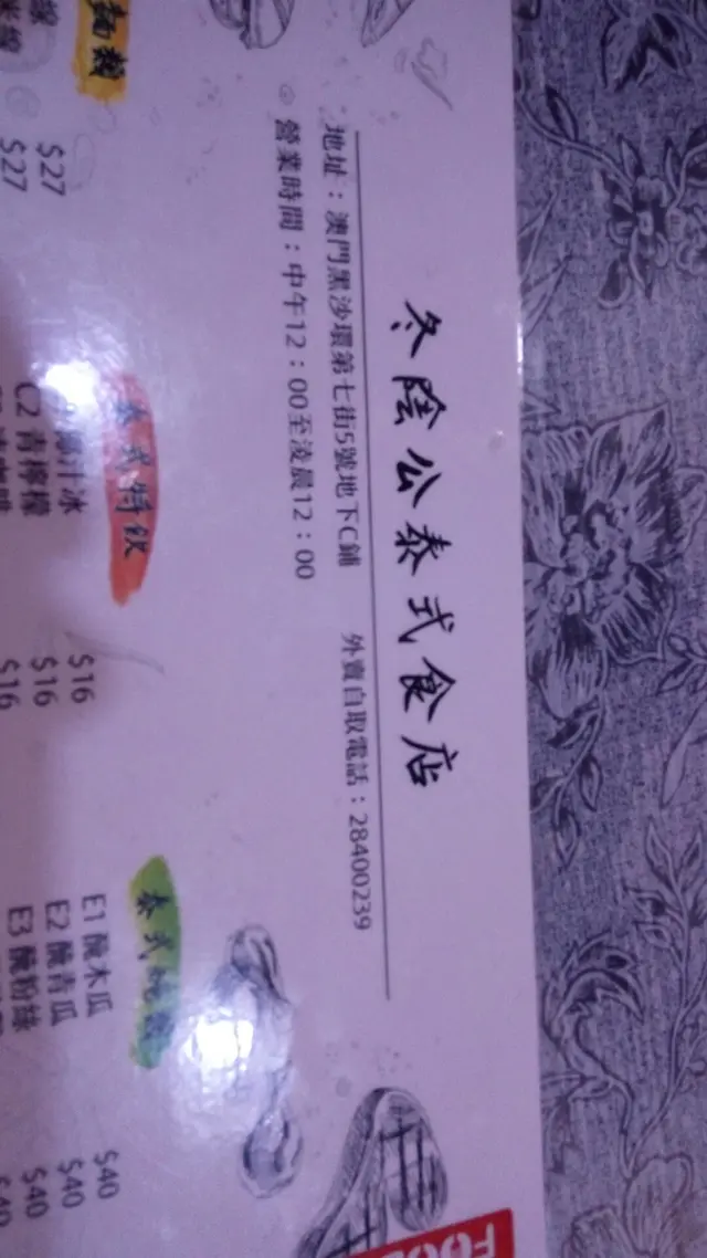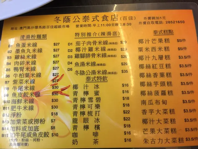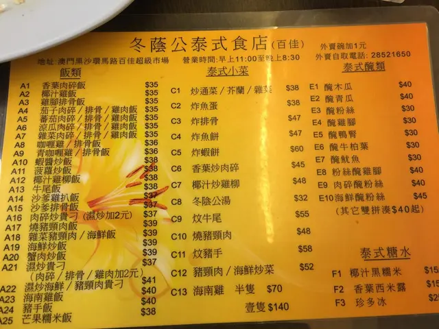 冬陰公泰式食店 (黑沙环) 网址: https://s.openrice.com/QrLS1EYy100 地址: 澳門黑沙環黑沙環馬路44號百佳購物中心1樓 电话: +853 28521650