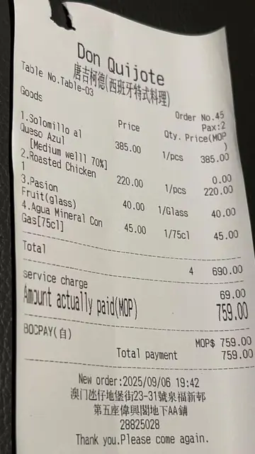 西班牙同葡萄牙既菜式一次过满足晒 味道正宗得嚟又有创意💡🏡呢间餐厅环境又有异国风情 侍应既服务又有礼貌🧑🍳 成餐饭既体验真系心情都靓晒好开心ar💖! 今次同男朋友试食左3种人气餐点 全部都好推荐🤤🥩 Solomillo al Queso Azul(蓝芝士牛柳,七成熟)牛柳切得厚身💪,外层微焦🔥,内里粉嫩多汁💧,七成熟啱啱好👌。蓝芝士🧀香浓咸香,融化喺牛肉上面,味道层次丰富🎯,入口即溶,够晒滋味😋!🍗 Roasted Chicken(烤鸡)鸡皮烤到金黄香脆✨,肉质嫩滑唔干柴👍,香料渗入肉里🌿,每啖都够味💥。配菜清新🥒🍅,摆盘整齐📸,睇得又食得,系一款稳阵又满足嘅主菜✅。🥤 Pasion Fruit(百香果饮品)饮品色泽鲜黄🍋,酸甜平衡⚖️,入口清爽💨,果香自然唔造作🌼。冰冻上枱🧊,啱晒配肉类菜式🥩🍗,饮完即刻醒神⚡,系炎热天气嘅完美配搭🌞!📍唐吉柯德氹仔旧城区地堡街23-31号泉福新邨第二期第5座伟兴阁地下AA舖…查看更多