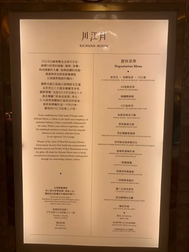 疫後澳門非常熱鬧,盛放荷塘令人賞心悅目。永利大門轉左就見倒川江月了,由於只做晚餐所以比較難book 位,預早WhatsApp send menu ,其實只有兩個餐,價錢不同主要有幾款用上名貴嘅食材,我地就揀咗平啲嘅set ,每位2888葡幣加10%入門確認訂檯,之後職員會幫你保管行李, 會問點稱呼,態度服務認真高質,相比香港米芝蓮更勝一籌。入內大概十張圓檯,六人檯嘅大細其實只會坐兩個人,因為要預留空間職員介紹菜式。餐前茶喺bar 位品嘗,用上高山水,特別嘅炭沖泡嘅普洱花我未飲過,連聽都未聽過,職員廣東話幾好,笑容都好好👍前菜三款,係自己揀,太多,事隔兩個星期我都唔係好記得,一款係棕櫚樹,有一款係筍。和牛酥口感非常鬆脆,好岀色😍Menu 係用奏摺型式展示,好有氣派👑。餐前小食共八款,四層塔模樣上菜,好有心思,有夫妻肺片,淮山…當中蟲草花係炸過好香口,冰菜亦好開胃🤤。酸辣湯辣椒油係後加,我唔太食得辣,所以staff會減辣避風塘蟹蟹係用上日本🇯🇵蟹,我覺得避風塘做法雖然惹味,但浪費咗新鮮嘅食材。黑松露鹹蛋糍粑新派川菜用上名貴嘅食材。扇貝珍寶扇貝用酥皮圍邊,打開見唔倒原粒大扇貝,原來做了扇貝麵條,真係別岀心材😊,不過配上椒我就覺得唔太夾野菌鴨肝凍由於一共有廿四味菜,嚟到呢道已經好飽好heavy , 縱然中途有提供茶消滯。麻婆豆腐每一道菜都好精緻,用雀巢為概念嘅麻婆豆腐好美觀,不過太濃味。擔擔麵麵由壺原條拉岀令人意想不到。甜酸苦辣一粒軟糖,4種感受整體係一個好好嘅體驗,打破傳統川菜感覺,耳目一新💗,雖然服務好,但主要用普通話介紹部分我聽得唔係好明😅😅…查看更多
