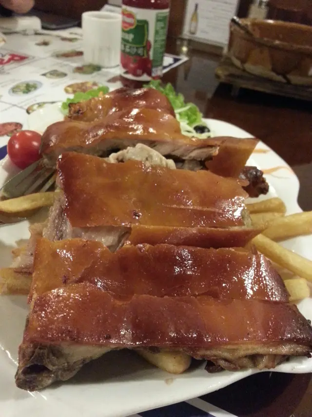 去到澳门梗系要食葡国菜啦😆今次系冇上网揾任何资料是但入咗一间葡国餐厅,因为都系比佢哋嘅装修吸引咗所以入去试吓,入面人流唔算好多本身都以为嘢食都普普通通,点知真系惊喜咗,好多人话去澳门一定要食乳猪🐽,所以我哋都试咗,佢哋嘅乳猪系偏向重口味,但系真系好香口,外皮好脆,可能都系因为好浓味所以小编都好钟意,猪肋骨🐷都系无论去到边度都一定要食,猪肋骨就正常发挥但系好食嘅可以叫😋小编全家人都非常钟意食淀粉,所以就叫咗蒜蓉包,我哋仲输到蒜蓉包价钱到底会几钱,点知真系大跌眼镜👀,全部人都估错晒,只需要$20都唔使已经有四块🥹,真系唔系好多地方可以食到,仲要呢个价钱呢个质素,因为去到呢啲地方旅游真系唔好听太多人吹嘘得太夸张嘅地方,反而去啲小众嘅地方仲令大家有惊喜😍😆