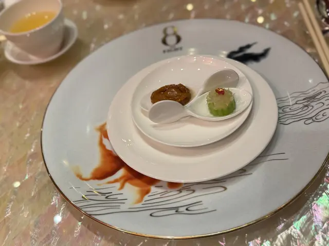 闊別澳門十多年後重遊,不知何時會再來,臨走朋友希望吃魚翅,大家當然舉腳贊成。以前曾在此食府用膳,那時亦以金魚作裝飾主題,多年後重臨,主題依舊,但整體裝修更添華麗。點了幾款點心和鮑翅,忽然待應便奉上每人一碟內有小鮑魚和梅子啫喱的開胃菜,雖然開胃菜並不特別美味,但還是讓我們有意料之外的驚喜。胖嘟嘟的金魚餃造型非常可愛,餃皮晶瑩明亮,藍天使蝦爽彈蝦味濃,令金魚餃的色、香、味更立體。黃魚餃的造型滑稽,餃皮有韌性但有點厚,魚肉餡料嫩滑,然而鮮味比較淡,百合米湯的質感很是濃稠,帶淡淡的粉香,整體平均,但試一次便可。牛肉球的賣相頗為有趣,穿上竹笙外衣的牛肉球就像一個球形的小蜂窩,窩孔吸滿了醬汁,為牛球保持濕潤,不須喼汁的加持也很美味。腸粉的粉皮十分剔透,清晰可見內裡滿滿的餡料,黑豚叉燒香甜嫩滑,薑芽起了點睛的作用,增香解膩。💢紅燒大鮑翅魚翅如一把扇般浸在琥珀色濃稠的高湯芡汁中,翅針根根分明,有別於仿翅的口感,魚翅入口軟滑,一梳一梳的小翅扒掛滿高湯芡汁,湯汁味濃醇厚,搭配的銀芽也飽滿閃亮,讓人很是滿足。葡撻和奶茶也是意外的餐後甜點,葡撻有點過甜而且蛋香不足,奶茶倒是幼滑,如同開胃菜一樣,這料想不到的甜點,成為這頓餐食的完美結局。埋單時,侍應送上每人一塊曲奇作為小禮物,心思可見一斑。…查看更多