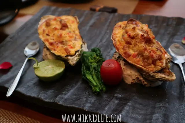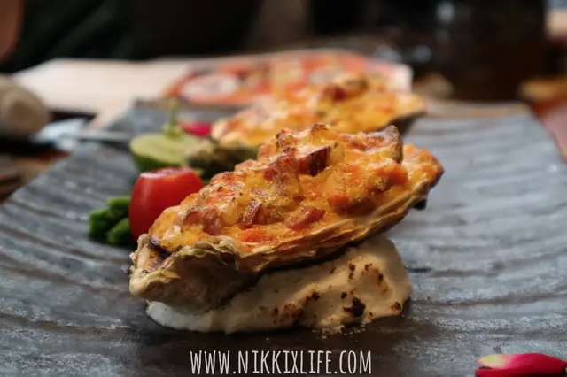 海膽燒生蠔把海膽燒好放在生蠔上用火槍輕輕灼過,吃到生蠔的鮮味之外,發現用火槍燒過的海膽味道更加濃郁惹味。