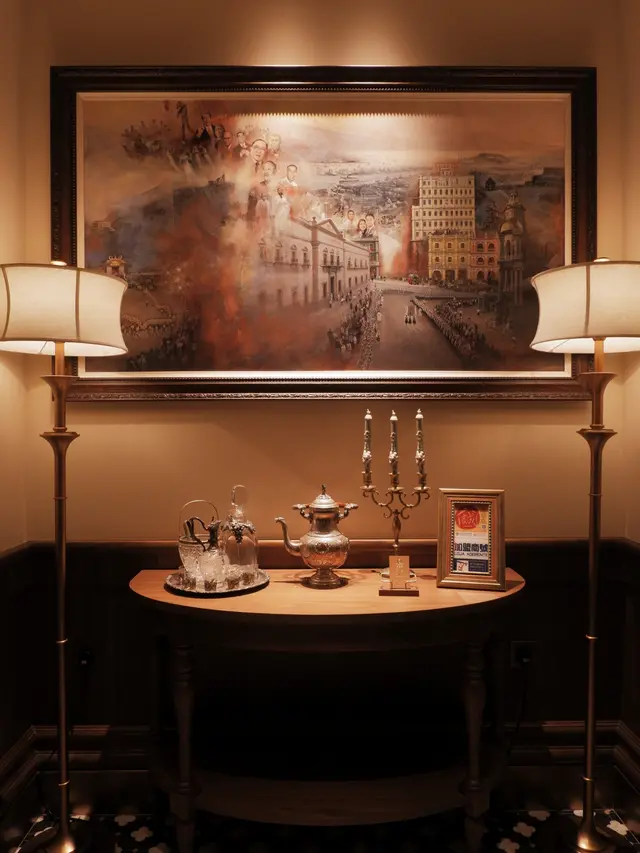 𖤐ˊ˗門口擺放了一套酒杯古董,走廊盡頭是酒櫃,