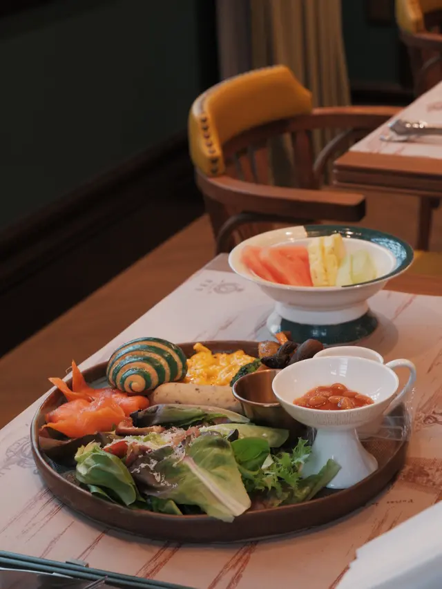 紐倫堡腸•炒蛋•胡麻醬無花果沙律菜•茄汁豆