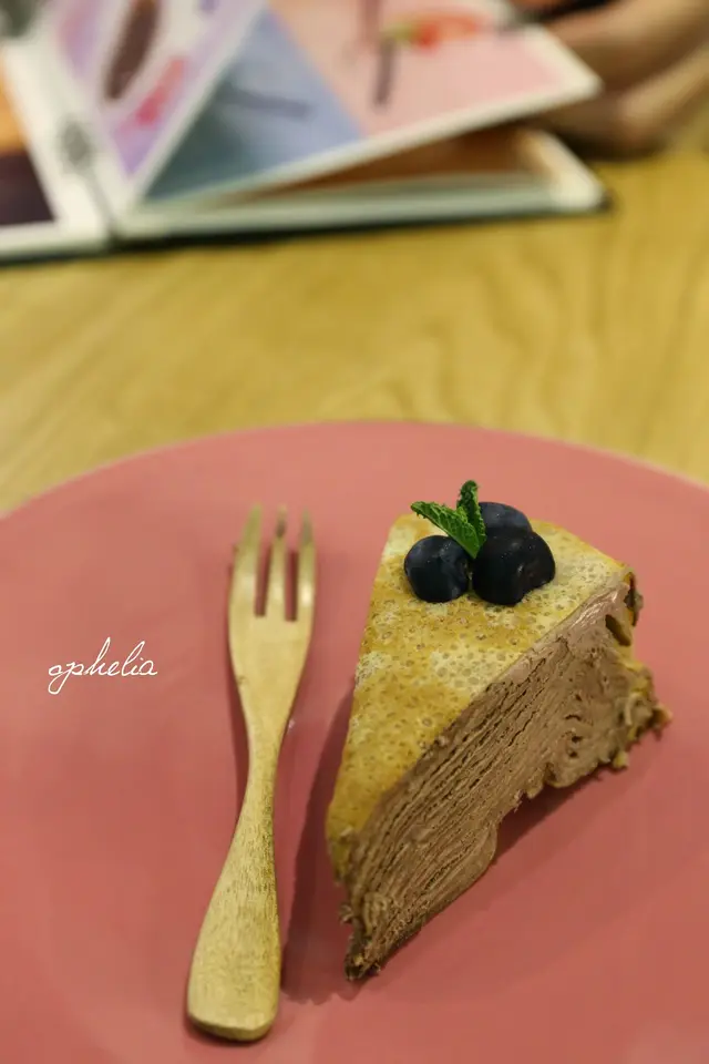 柔滑甜美的餅皮富微彈性,配上巧克力的濃郁而不甜膩~ 喜歡它選用的木質感餐具