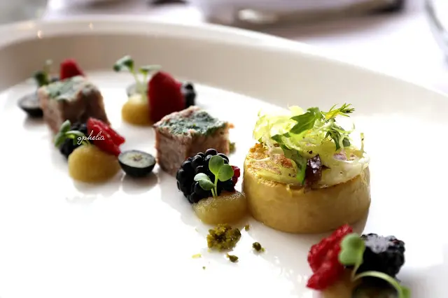 我的前菜是 法國鴨肝豬肉凍批 配 醃制蔬菜根蓉及紅莓沙律 伴開心果及麵包,像畫般的擺盤美極了
