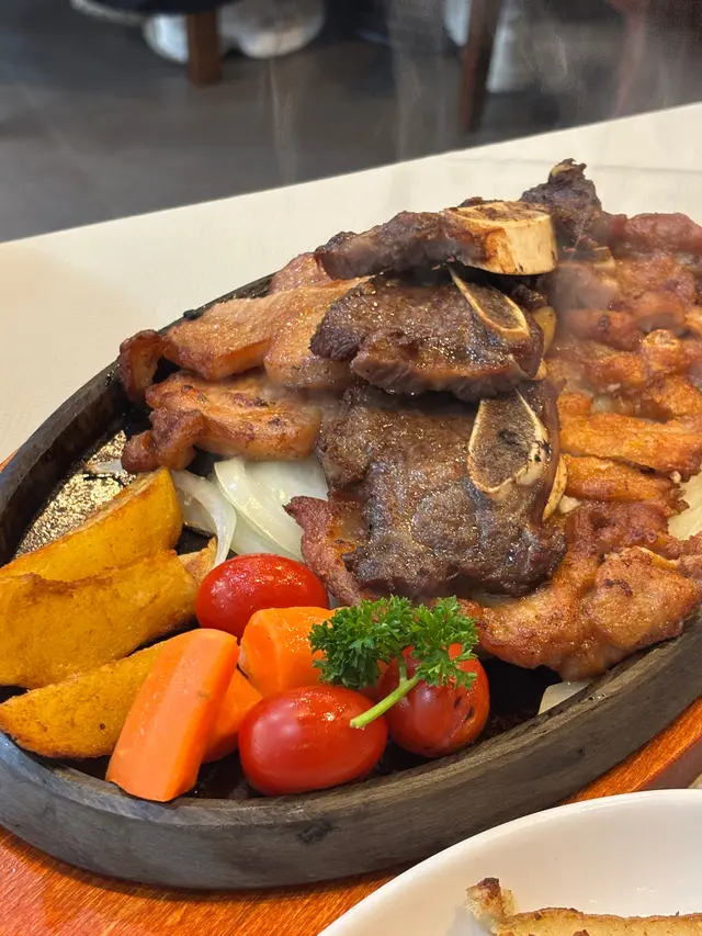這間餐廳絕對是我近期用餐中最令人驚艷的體驗!從第一眼看到這幾道菜品,色香味俱全的呈現就讓人食指大動。圖片中的牛排料理尤為出色,肉質鮮嫩多汁,烤得恰到好處,帶有誘人的焦香,搭配上新鮮的迷迭香點綴,更增添了風味層次。旁邊的薯條和烤蔬菜如番茄和南瓜,口感酥脆且鮮甜,完美平衡了肉的油膩感,讓整道菜呈現出和諧的口感與味道。另一道帶骨牛小排同樣令人讚不絕口,肉質軟嫩,骨頭周圍的肉汁溢出,咬下去滿口都是滿足感,搭配洋蔥和胡蘿蔔的清新口感,實在是下飯又開胃。
