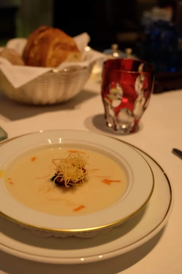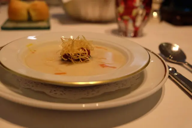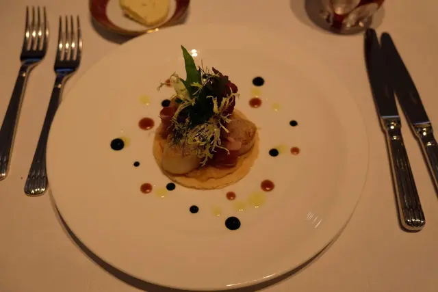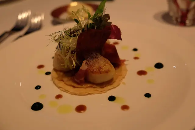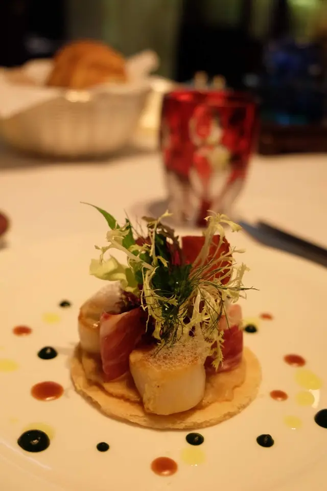 前菜為輕煎帶子伴葡萄牙火腿,這個菜色實在叫人想起了天巢法國餐廳,無論外表,美術指導,擺位,都像藝術品一樣,帶子是在生與熟之間的美,葡萄牙火腿的鹹和重量令帶子帶出了不同的感受,加上不同的沙律菜,絕對是引領你大開胃口的作品。