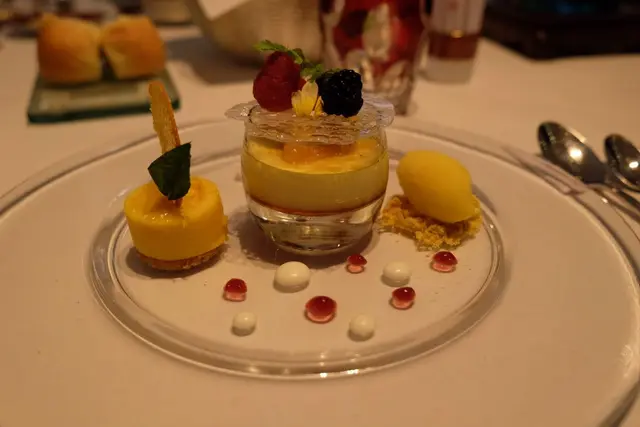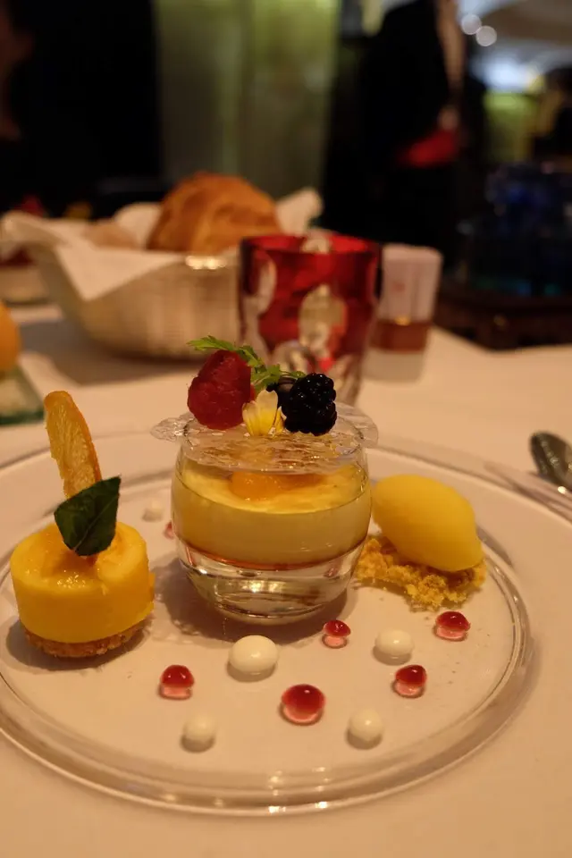 話咁快上甜品,不過這幾個菜已經吃了一段時間,幸好這裡能夠慢慢放鬆腳步欣賞,焦糖燉蛋及橙卷配橘子雪葩都非常精美,焦糖燉蛋不是太過甜但滑得令人感動,橙卷配橘子雪葩的清淡令味覺可以舒發剛剛的刺激,慢慢消化今晚整體的精彩。