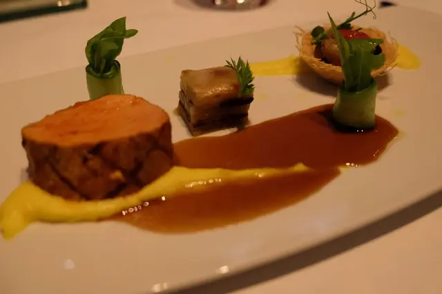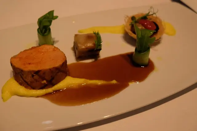 第二個主菜為炭燒黑豬配黑腸蘋果千層,厚切黑豬在炭燒下那種香就如用炭燒鵝一樣的道理,吃完後送上的蘋果千層就如薯菜一樣,加上醬汁和那一點的沙律菜,比剛剛的香煎黑鱈魚配蠶豆及番茄醬濃烈得很,更餘音裊裊。
