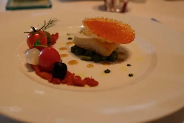 第一個主菜為香煎黑鱈魚配蠶豆及番茄醬,又係靚靚的擺設,黑鱈魚非常香氣撲鼻,吃下去清新而魚味強,油香一流,底下的蠶豆及蕃茄醬和蕃茄讓你幫助消化,當然不能少的橄欖,令整體的酸甜鹹味更balance更平衡有致。