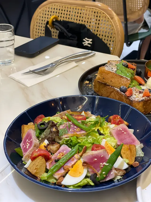 尼斯沙律大大份,有半熟吞拿魚、新薯、雞蛋、四季豆等等,色彩繽紛,令人胃口大開。