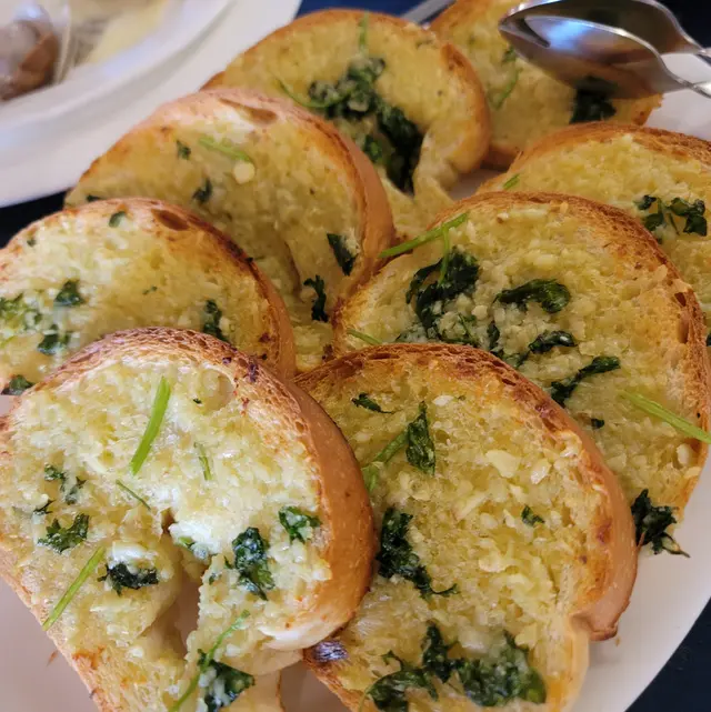 ‧ 蒜蓉包:麵包即烘即上,邊位微焦,蒜茸與橄欖油滲滿孔隙,外脆內鬆。