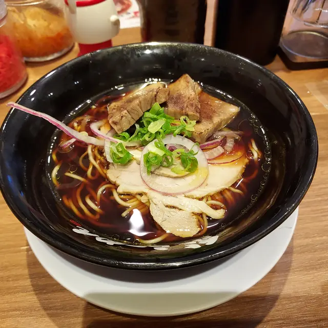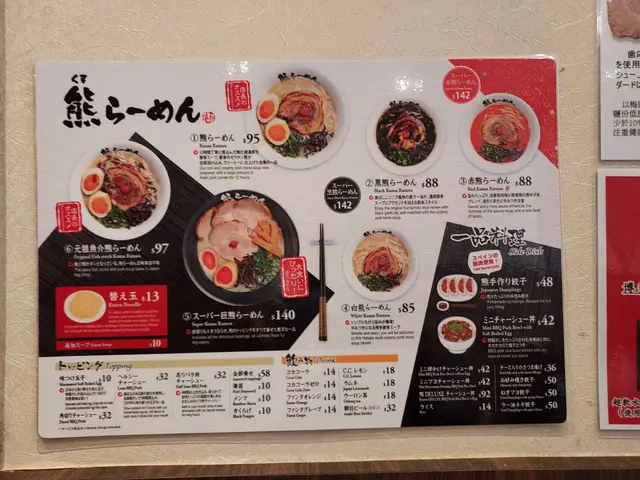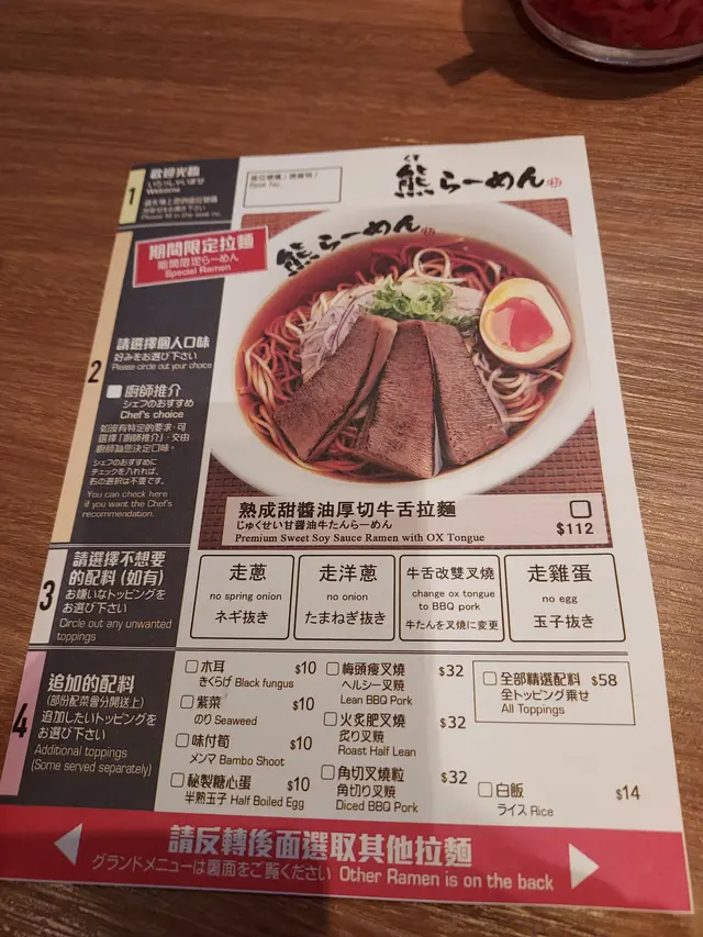 有一天,經過上環,專程去找熊拉麵,在蘇杭街街角的小店,店內大概廿個位,有四人枱和吧枱。跟其他日本拉麵店一樣,有不同湯底,原味、黑、白、紅等。跟其他日本拉麵店不同,熊拉麵有期間限定拉麵。今次期間限定,熟成甜醬油厚切牛舌拉麵。厚切牛舌,與別不同,好腍,好入味。除了三塊牛舌外,底下還有梅頭瘦叉燒。拉麵,由廚師決定口味及軟硬。湯底也很特別,熟成甜醬油。總之好味,我會推介。在熊拉麵,有兩種拉麵選擇,博多幼麵,及熊本中幼麵。熊拉麵,可以選擇三種不同的叉燒,梅頭瘦叉燒、火炙半肥瘦叉燒、及角切叉燒粒。加麵,價錢合理,$13,好大碗,好飽肚。熊自家製餃子,$48,正常發揮。總評味道:一分錢,一分貨,中高級日本拉麵店;環境:環境很舒服,我喜歡小店;服務:店員有禮貌;衛生:乾淨。…查看更多