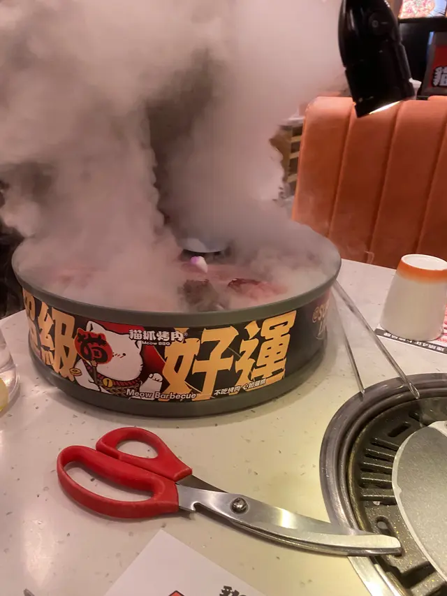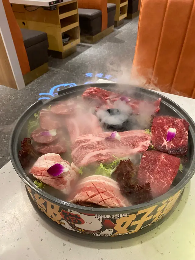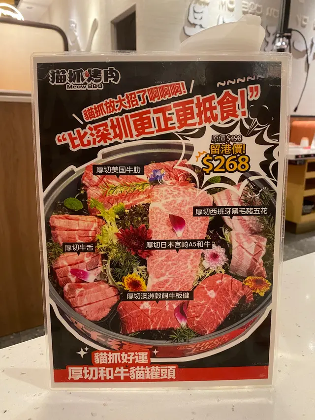 朋友話最近去咗一間以貓貓為主題嘅餐廳,身為奴才嘅我二話不說就約埋主子契媽去試吓!Menu有好多款式,有拼盤又有散叫,店員推介我哋點做緊優惠嘅「厚切和牛貓罐頭」,大大份先話$268,啱晒唔想用腦只想食肉嘅我哋!呢個拼盤一上枱就令我哋好興奮,因為佢用一個巨型貓罐罐裝住啲肉,店員一打開罐蓋,乾冰嘅煙霧效果就出晒嚟, 非常高級,梗係要狂影相啦!貓罐罐入面有厚切美國牛肋、厚切西班牙黑毛豬五花、厚切牛舌、厚切日本宫崎A5和牛同埋厚切澳洲縠飼牛板腱,冇錯!呢個罐入面全部都係厚切,啖啖肉真係好滿足!除咗厚切牛舌比較難咬之外,其他肉都好腍,主打嘅A5和牛真係好好食,油花分佈剛好,唔會成口油~一場嚟到,我哋仲點咗電視節目有介紹嘅貓抓泡椒肥牛,見到一排肥牛上面滿滿嘅泡椒醬料,兩個人合力夾住頭尾搬上去燒烤爐,好快就食得!呢款肉真係全場惹味NO.1,泡椒辣得嚟好清新,雖然食完要飲水解解辣,但真係辣得好過癮呀~朋友見貓抓洋葱牛小粒都係餐廳推介,就心思思想點嚟食,但之前同佢食燒肉放題食到咬唔爛嘅牛小粒,我哋都有啲擔心同類產品會唔會有一樣問題。結果呢度嘅牛小粒冇筋之餘仲好軟腍腍,而且份量都多,仲炒埋個洋葱嚟食,勁香口!食完咁多肉,當然唔可以錯過甜品啦!呢度嘅甜品款式比同類烤肉店多,而且款款都好啱用嚟打卡~我哋點咗一人一個貓抓焦糖布丁,$22呢個價錢真係冇得挑剔,即叫即做,上面仲有一個可愛貓手~最後仲忍唔住再叫多個白喵雪花冰,層次分明,又靚又好食!因為甜品即叫即做,建議大家要早15分鐘就落定order,咁就唔駛慢慢等啦~!又有和牛又有甜品,最後埋單每人唔駛$300,我哋就覺得抵過食放題,朋友仲話下次要叫朋友嚟試試,可以再戰!…查看更多