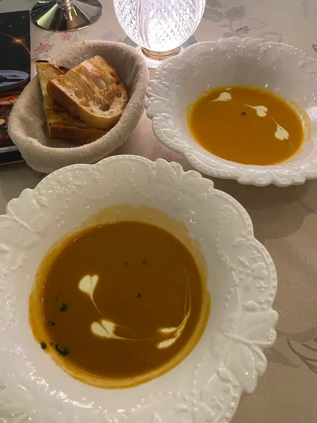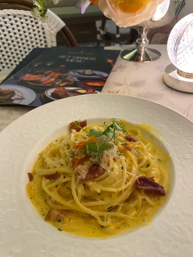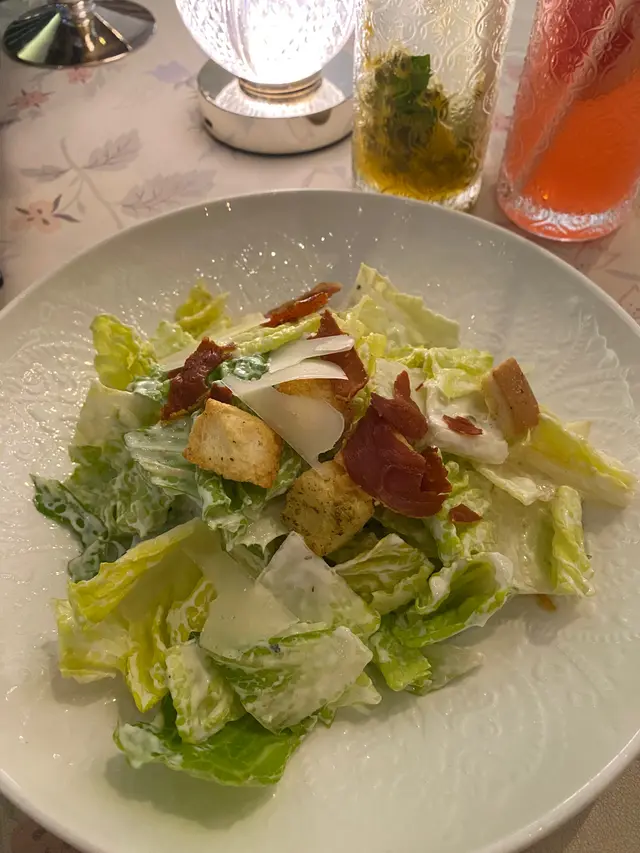 早有聽聞呢間餐廳,睇到相都已經覺得裝修真係超級靚!估唔到去到現場,發現比想像中更靚,店員仲安排到我地坐噴水池隔離,同隻可愛熊公仔同枱,勁有feel!店員推介我地點咗個火焰牛扒二人餐:凱撒沙律份量好多,生菜好新鮮,搭配少少煙肉同芝士,加埋個醬汁,好清新開胃!我最鐘意香脆麵包粒(croutons),咬落去好脆,口感加分!餐湯是日餐湯係甘筍湯,我地另外加錢($38)點咗個法式龍蝦湯,兩個都好好味!是日餐湯有少少薑味,但又唔會好搶,成個湯好滑;而龍蝦湯我以前試過喺酒店自助餐飲過,一股苦味令我驚咗呢個湯,而呢度個龍蝦湯我強烈推介,又靚又香又好味,朋友飲到讚不絕口!跟湯仲有烘到香噴噴既麵包,好好味呀!卡邦尼意粉呢碟意大利煙豬面頰肉卡邦尼意粉,醬汁係卡邦尼嘅經典蛋黃加帕馬森芝士組合,creamy得來帶點濃郁香氣,份量足夠兩個人share來食,啱晒鍾意軟身口感嘅朋友,食落好似被溫柔包圍咁。煙豬面頰肉(Guanciale)偶爾咬到一片,會有陣淡淡嘅鹹香爆出來,幾有驚喜!干邑火焰牛扒今晚既重點嚟啦!一上枱,呢份「干邑火焰牛扒」即刻搶晒眼球!侍應喺我地面前點燃干邑,火焰竄到好高,好似睇咗場show咁,好有氣氛!牛扒係阿根廷Angus牛,燒得外焦內嫩,切開仲有粉紅色嘅肉汁滲出,望落就知juicy到爆。食落去牛肉未香濃,唔會太乾!最驚喜係旁邊嗰粒烤蒜頭,成粒軟腍香甜,入口即化,搭牛扒食簡直係絕配,食完完全唔覺得heavy。而且份量都好足,食完好滿足!如果你鍾意有視覺同味覺雙重享受,呢個火焰牛扒絕對要點呀,強烈推介!飲品:熱情果薄荷梳打/葡萄柚檸檬梳打估唔到飲品都咁靚呀!杯身透亮,「熱情果薄荷梳打」勁大片熱情果,放入氣泡水度層次分明,仲有幾片新鮮薄荷葉漂喺上面,影相打卡絕對無得輸!飲落去,熱情果嘅酸甜味好突出,帶出熱帶水果嘅濃郁香氣,搭上薄荷嘅清涼感,爽到不得了!而「葡萄柚檸檬梳打」入面有大片葡萄柚點綴,葡萄柚嘅微苦同檸檬嘅酸爽完美融合,酸酸甜甜嘅口感好開胃,食完重口味嘅牛扒後飲呢杯,解膩又醒胃!因為已經食到好飽,就冇點埋甜品試,有少少可惜呢!不過其他朋友見到我share既餐廳照片,已經話要約我去食飯打卡啦,睇嚟好快有機會試埋佢地既甜品啦~!…查看更多