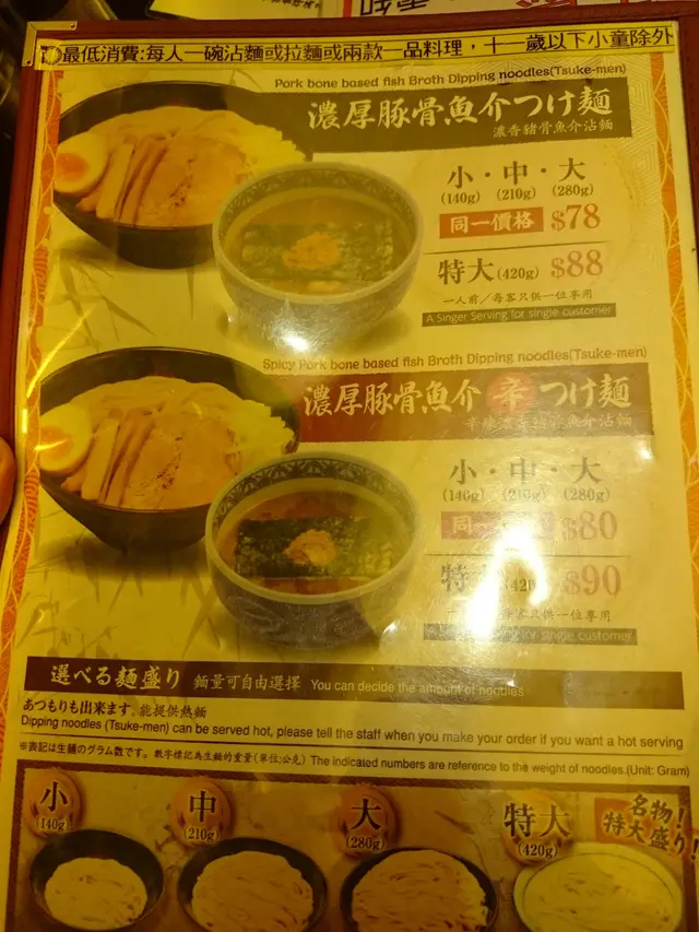 又去到佈滿拉麵店既銅鑼灣燈籠街,今次簡左日本過江龍三田製麵所(仲有兩間未試,唔計豚王).....簡左佢既原因係已經唔洗再排隊~需知道一開業好有人氣.呢間既沾麵好似好出名~~那就試試$88 既豚骨魚介吧,88蚊係因為佢有420g既麵,如果細食既可以簡番$78既份量.麵條係好煙韌既,但掛湯力不見強.呢個唔係重點,那個湯汁真係唔好食,佢地應該係以豚湯和魚介粉溝埋,加上適量既醋而做成.但個問題係,佢溝出來個味道好不討好,既沒有豚湯味道,魚介亦唔香.都唔講佢地無靈魂死實實既叉燒和蛋蛋,另外湯汁溫度是暖暖的.如果大家未試過既,我建議可以剔走呢間..…查看更多
