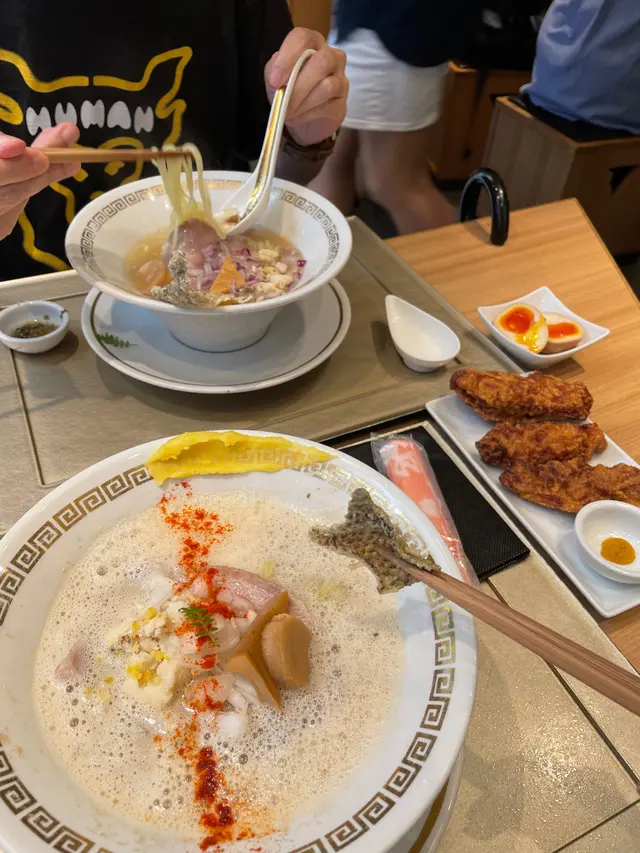 自從幾年前喺東京食過鯛魚湯拉麵之後就念念不忘,原來香港都有一間鯛魚湯拉麵,一定要試啦🤗平日中午12:30來到,排第6,等了20分鐘左右就入得。由於未食過,所了叫了一個鯛白湯$138、一個鯛清湯$138試吓先。鯛白湯好香濃,湯呈奶白色,看得出用料好足熬製出嚟、有很多魚肉碎,唔腥,都幾鮮味😍另外鯛清湯個湯底望落好清,但估唔到都係好鮮味,仲有炸魚皮,超脆口🤤另叫了櫻木煙薰糖心蛋$15,好好味呀,而家諗起都回味🤤🤤🤤一個要加蛋呀!而小食日式炸雞有三件,都算大件,外脆內軟,仲好juicy ,點少少咖哩粉食好正👍🏻👍🏻…查看更多