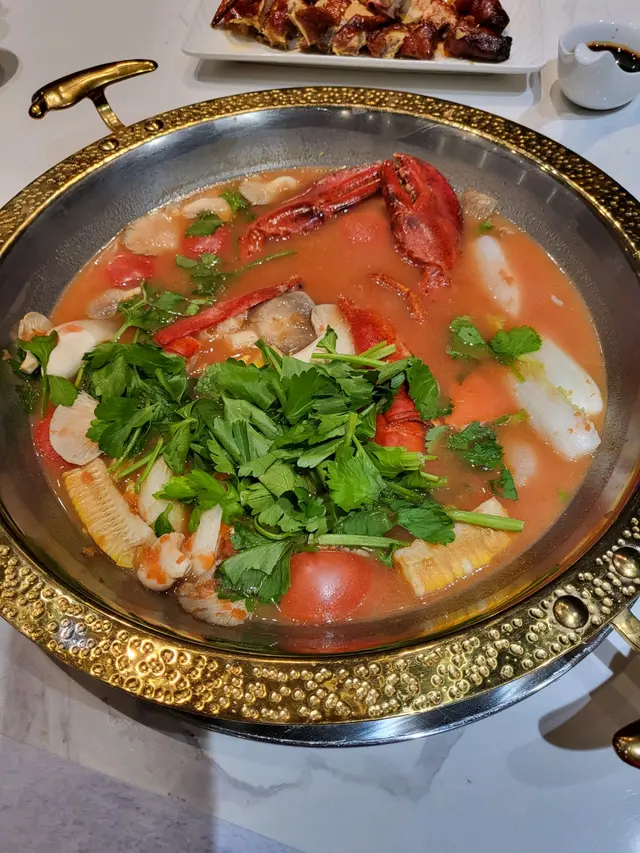 我地點了兩個特色湯底,鮮茄龍蝦鍋和醉雞鍋,原隻大龍蝦和醉雞在鍋內,份量十足,睇見到流曬口水