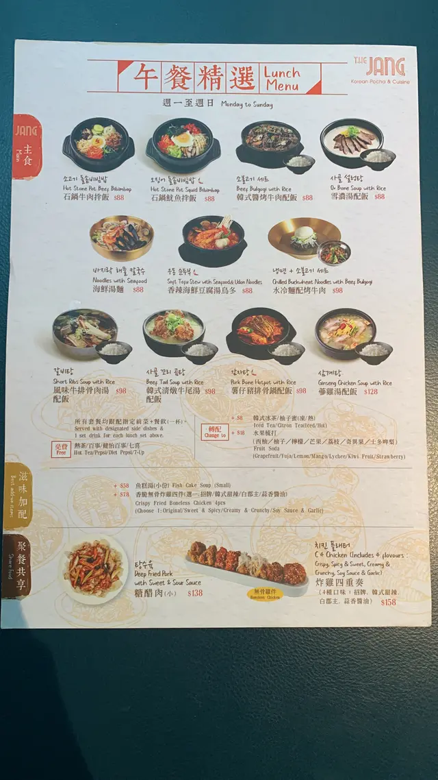 午餐真的值回票價 很多餸菜也可以用優惠價品嚐人蔘雞湯 燉牛肋骨 韓式香辣海鮮豆腐鍋 辣魷魚飯 石頭鍋拌飯 部隊鍋 韓式湯麵/拉麵 多樣韓式湯飯多款好味前菜 還有韓式炸雞 韓式飯卷 海鮮煎蔥餅 泡菜煎餅 應有盡有 當然不能欠缺韓式燒肉 這裏的醬汁及配菜份外美味 例如炸雞 相伴的韓式伴菜蘿蔔 飯卷相伴的韓式小辣醬汁 各類煎餅的香味醬油 燒肉內 還有蒜頭、醬料及生菜 頓時增添口感及美味特別一提 炸雞 牛肋骨 人蔘雞湯 蔥煎餅 及前菜十分美味可口 另外優質服務態度 也令我多次回頭光顧