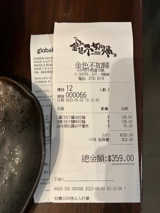 呢日出開尖沙咀想食拉麵,所以上網搵左呢間由貝汁拉麵,係話每日新鮮直送60斤大蜆熬製,同埋唔添加味精。入到去唔使排隊就直接坐低,點左兩個招牌貝汁醬油拉麵同貝汁鹽味拉麵,一個小食-涼拌黑松露紋甲墨魚。本身想嗌既磅蟹湯底無得售,可能係季節限定。醬油拉麵 - 味道較濃鹽味拉麵 - 味道清淡相同之處都係有少許黑松露味同鹹香味,但食完唔口渴,真係無味精。墨魚 - 酸酸地幾開胃兩人埋單: $359 人均消費$180 唔算好飽。價錢偏貴,整體評分中上。…查看更多