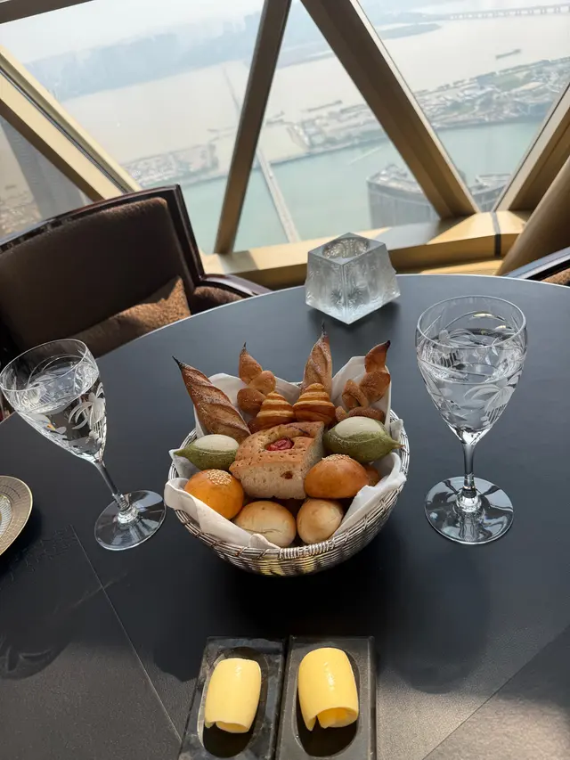 特意由香港來澳門吃這餐飯預先訂位,deposit 每位500大堂Lift只到39樓,此為餐廳接待處,由職員確定booking 再一起轉專屬Lift 上43樓,所以私隱度相當高,絕不會有白撞/想打卡的客人到餐廳餐廳樓底很高,落地玻璃,餐桌向海。2人提供4椅,可放袋。set lunch 很多款,中英對照,松露餐3000多- 4000 MOP不等,經濟的set lunch 由2道菜998起,其實所胃的兩道菜還有加上沒在menu上的麵包,開胃菜,甜品….,所以都非常足夠。先來的是麵包車,很震撼,有多款口味,牛角包,酸種包,波菜包..軟身的,脆口的..每款也會放於籃上檯,有來自法國原味及鹹味牛油,如果包未吃完的,最後會入袋給你外帶。之後是menu 上沒有的開胃菜,花花彩紙過膠托底方便隨季轉換,器皿是透明酒杯但躺型,內裡是南瓜口味配菇及葵花子。Starter 加了400轉魚子醬配海鮮凍椰菜花忌廉,賣相就是一幅藝術品,蟹味再加上魚子醬口感一流,不過多吃就有點鹹,最理想只選一客,二人淺嘗。Main course 加了400轉鹿兒島和牛,5成熟,口感就是大家一致認可的日本高質,另配沙律及薯蓉。另一個選了帶子,好鮮甜大粒之後有雪糕車,雖然賣相一般,但開心果口味非常香濃,水準極高之後是Madeleines蛋糕,暖暖的,剛焗起,新鮮套餐含coffee or tea , 點了latte 甜品可選芝士車or甜品車,我們就揀咗甜品,多款口味,每人可選兩款,香印蛋糕,粟子蛋糕..我就點了signature 啤梨,紅色外層,口感爽脆,另外一件是拿破倫,一般般原來還未完..再來另一架甜品車,份量較少,選了開心果蛋糕及彿手果糖總括米芝蓮三星你值得擁有…查看更多