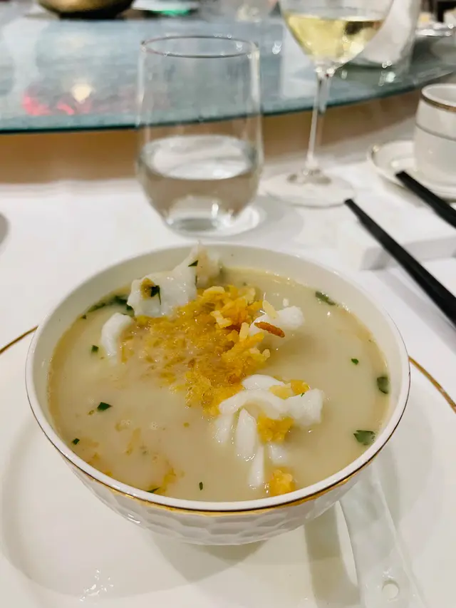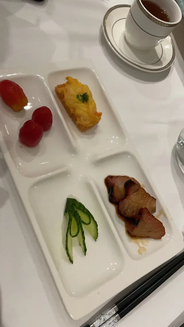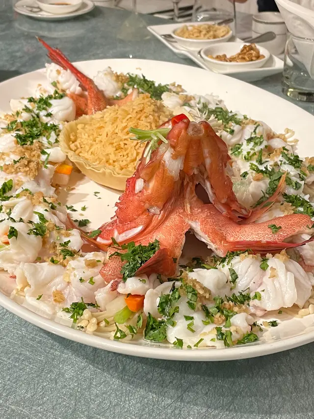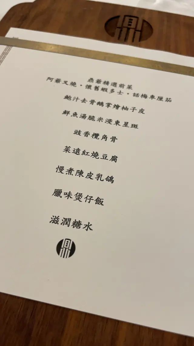 以前訂位要等好耐,知道鼎爺私房菜搬咗新鋪,同一班朋友都訂位約食飯。新鋪地方大啲,坐嘅空間都舒服👍🏻大部份菜式都保持水準,全晚菜單包括:阿爺叉燒,記得要趁熱食;懷舊蝦多士,脆卜卜;話梅車厘茄,好開胃醒神;食完呢幾個前菜都好滿意。主菜開始有:鮑汁去骨鵝掌燴柚子皮,10分推介,係難得有心嘅功夫菜,鵝掌全隻去骨最啱我呢啲懶人,柚子皮完全冇渣入口即融。鮮魚湯脆米浸東星斑,東星班非常新鮮配合香菜提升魚香鮮味。菜遠紅燒豆腐係我最愛,豆腐夠嫩滑,每次都會encore。慢煮陳皮乳鴿,用慢煮方法比油炸更能品嚐乳鴿鮮味,肉質更加滑溜,陳皮香氣配上乳鴿嫩肉,非常特別嘅煮法!已經好飽,但係都忍唔住要食臘味煲仔飯,識得一提潤腸非常好食😋最後糖水係懷舊明目萬壽果糖水。每次去鼎爺私房菜都食得好開心,非常有心嘅功夫菜,好適合一班朋友訂房聚會!