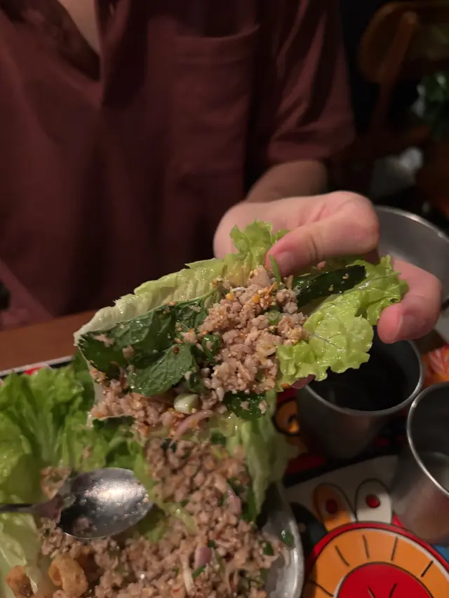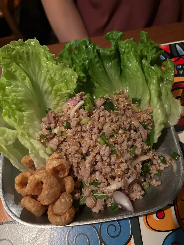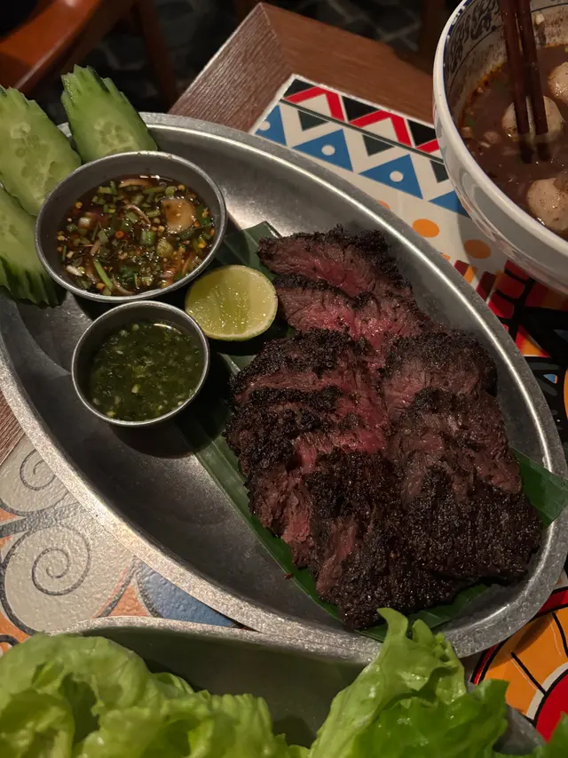 泰排檔喺中環,好有泰國街頭 feel,牆掛住彩色燈籠,木枱同竹椅,氣氛熱鬧,啱晒放工嚟同朋友食嘢。首先點左泰式燒和牛柳,牛柳片切得厚身,燒到外邊微焦香噴噴,咬落去肉汁爆出,牛味濃郁軟嫩唔柴。泰式醬汁酸酸辣辣,混咗魚露同檸檬汁,輕輕嗆喉好過癮,熱辣辣食好正,有5-6片,啖啖肉香,油脂分布平均。🥩黑豚肉船麵,碗麵熱騰騰,寬條米粉吸滿湯汁,滑溜溜好彈牙。黑豚肉切薄片,肥瘦啱好,入口化開,油香同肉味喺舌頭散開,唔會膩。湯底用豬骨同香料煲成,鮮甜帶微辣,豆芽爽脆,湯汁惹味,暖胃又滿足,層次好豐富。🍜生菜包香葉豬肉碎,豬肉碎炒到粒粒鬆散,邊位微脆,內裡 juicy 帶豬香,羅勒香氣衝鼻,辣椒粒一咬微爆,辣味喺口腔跳動。生菜葉大片,綠油油好脆口,無苦味,包起豬肉一啖咬落,生菜汁水同肉汁混和,先脆後軟,咸甜酸平衡,顏色鮮豔,食落清爽解膩,旁邊嘅炸豬皮勁脆卜卜,好鬼正。🥬…查看更多