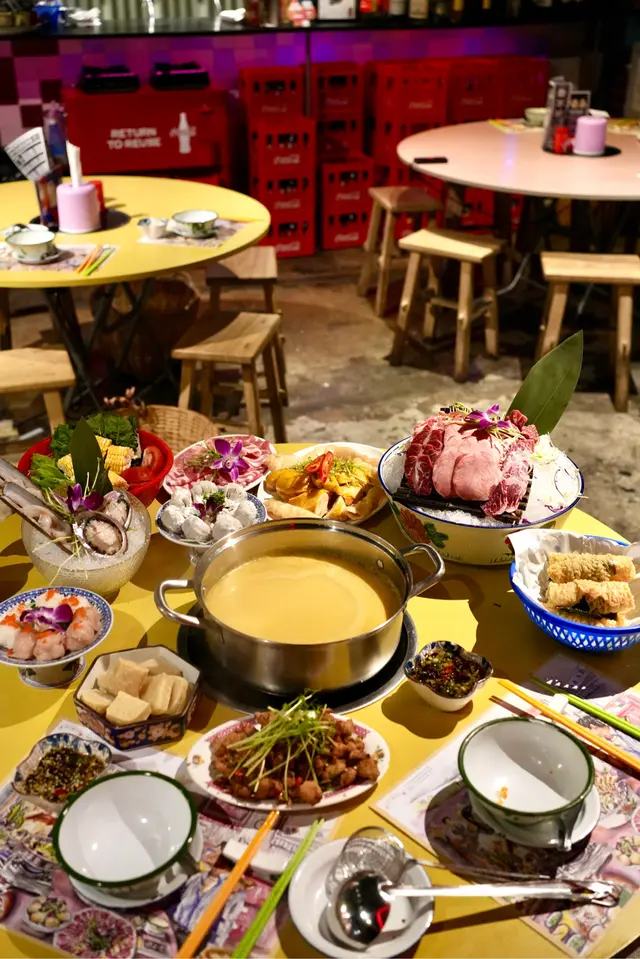年紀相約既人約食飯,揀左個好地方。雖然地方唔大,但設計用心,霓虹燈,仲有枱枱凳凳,同埋其他配置都喺懷舊港式風味。晚上一班人熱熱鬧鬧,播埋舊歌,氣氛十足。而家仲有限時$1枝啤酒,10枝起計,勁抵飲。港式打邊爐有咩食,相信唔使我多介紹,海鮮、豬牛羊同埋丸餃做膽,仲有椒鹽乜乜都可以食到。咁熱鬧嘅環境,店員招呼都好殷勤,主動加湯,又會收走碗碟。咯咯雞花膠湯金黃色嘅花膠雞湯真材實料,雞同花膠一大碟比你。雞本身已經有8成熟,口感鮮嫩,加埋花膠落湯度,成個湯底原汁原味,真係先飲為敬。牛魔王拼盤 本地手切肥牛、安格斯牛頸脊、牛脷托、封門柳、牛肉粒、黑安格斯牛板腱,用冰坐住成盤上,夠晒豪華。各款牛肉既質素平均地高,相信牛魔王都冇投訴。紫菜炸響鈴如果平時打邊爐要食響鈴真係要試試,響鈴大大個,裏面卷住紫菜,即叫即炸,輕輕一灼,紫菜香味,尤其突出,享受豐富層次。蘇格蘭蟶子 南非鮑魚 鮑魚同蟶子同樣爽口,來貨新鮮。西班牙黑毛豬 肥瘦相間,令瘦肉甘香而不硬,令人回味。招牌芫茜餃一咬開係飽滿既芫茜餡,芫茜香味直撲入鼻,絕對適合芫茜關注組人士。Q彈鮮蝦丸併Q彈墨魚丸 Q彈冇呃人,加埋蟹籽賣相更吸引。冰豆腐吸湯之選。椒鹽雞軟骨大排檔版本既椒鹽雞軟骨,港式風味,香口惹味,餸酒一流。…查看更多