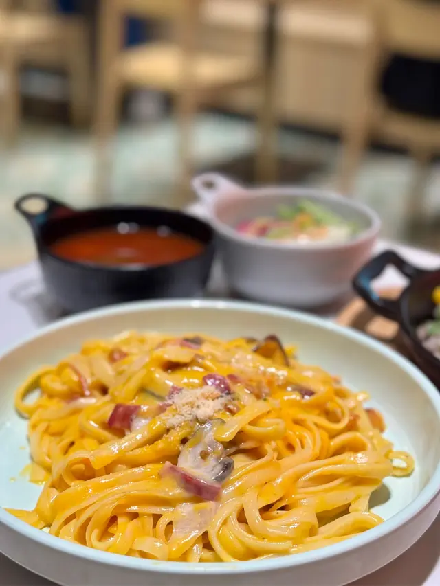 朋友叫我試呢間小店 原來真係有驚喜🤭入面環境舒服光猛 店員好友善 出餐速度好快好多家庭帶埋小朋友黎食dinner 主食+$21就有埋沙律、餐湯同是日甜品甜品有唔同味嘅cheese cake 揀左柚子同朱古力😋 ✧ 鐵板燒汁牛肉片飯 $80牛肉片幾嫩 用鐵板嘅餘溫整熟加埋燒汁味道啱啱好 太陽蛋係精粹🍳如果加少少牛油會再邪惡啲🤤✧ 蛋黃煙肉卡邦尼扁意粉 $58煙肉有鹹香 食落好creamy🥰份量啱啱好 食到最後都唔會太漏🤭✧ 百香果沙冰 跟餐+$15呢個真係好似cafe嘅飲品 必點!酸酸甜甜飲一啖即刻 refresh 晒🫰🏻…查看更多