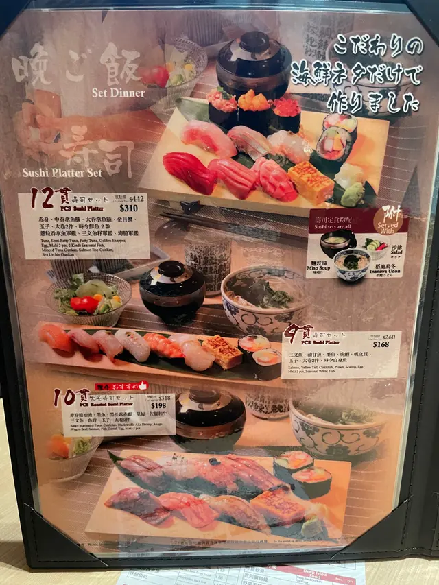 晚市套餐.前菜沙律, 黑芝麻醬幾開胃,壽司都味黎, 就已經黎左個烏冬.清清地,食完都已經飽飽地.....分別點了9貫同10貫壽司唔知係咪因為set關係, 完全冇鮮味,唔好食另外點了天婦羅,反而呢個有驚喜天婦羅粉好薄,野菜好食,仲有洋葱天婦羅,幾特別.…查看更多