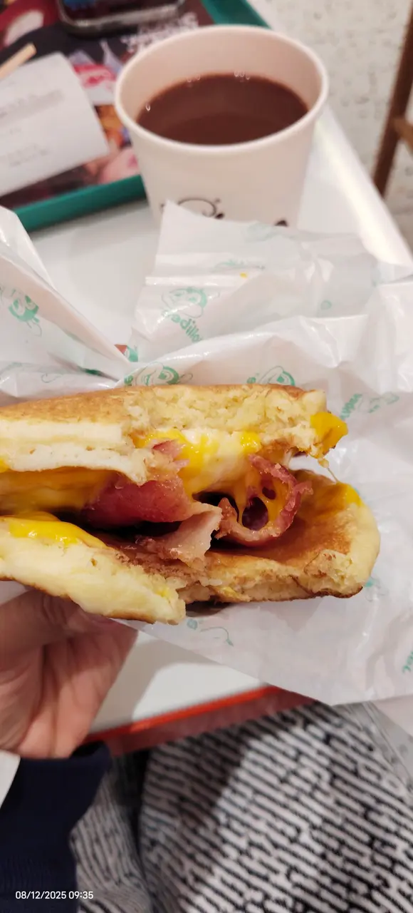 上次試左pancake 火腿蛋包幾好味,今次試個煙肉蛋pancake包跟朱古力 ($25 set), 塊煙肉就細d, 唔似上次火腿有2塊咁多肉,個pancake就一樣咁軟,冇麥當當果隻咁甜,呢個pancake幾好味。但個朱古力就勁啦,甜到好似綿花糖朱古力咁甜, 好誇張🤣 試晒2款pancake包對比下,我覺得火腿蛋款好味d, 咖啡可能叫返齋啡就算。老公試佢地咸牛肉蛋包(唔記得影相),個包似魚柳包隻包,但個包厚身少少,佢話個咸牛肉蛋好味,但細份左少少。我有試佢杯奶茶,茶味濃度正常,但落晒一包糖都好似冇落咁冇甜味🤣…查看更多