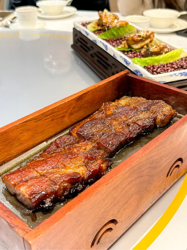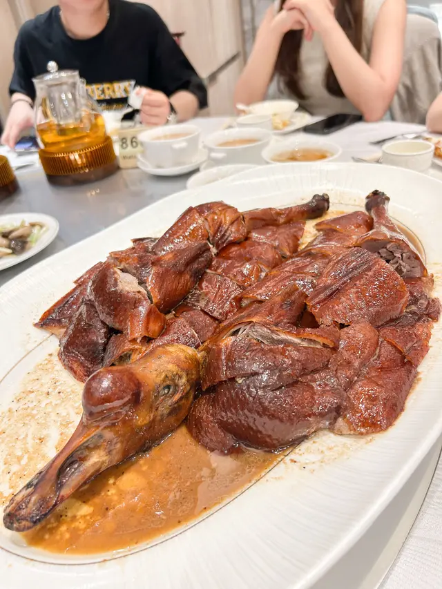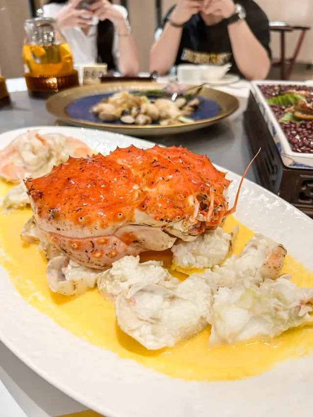 利舞臺頂層的海港薈新開業兩個月,裝修雅致寬敞,環境舒適,侍應服務亦十分貼心,整體用餐體驗相當令人滿意。這次點了招牌的阿拉斯加長腳蟹(三食), $1200的長腳蟹大得誇張!分三種吃法:15年花雕雞油蒸長腳蟹身、燒汁煎焗蟹腳、法國黑松露蟹膏燴伊麵。蟹身蒸得極為鮮嫩,花雕雞油香氣十足,蟹肉啖啖鮮甜多汁,而且廚房細心預先將蟹腳開邊,省去吃蟹時開殼的麻煩,讓食客可以輕鬆享用。煎焗蟹腳燒汁味道濃郁,火候恰到好處,每隻蟹腳都是肉嫩飽滿。最後的蟹膏燴伊麵香氣迷人,帶出蟹膏的濃郁鮮味,風味十足,完美收尾這道海鮮盛宴。另一道金蠔法國鵪鶉生菜包,以金箔點綴,看得出擺盤的用心及氣派。鮮味十足的金蠔配上嫩滑的鵪鶉肉,包裹在爽脆生菜中,口感層次豐富,令人回味。黃金鵝肝素鵝也是招牌之一,鵝肝的香濃和鵝肉的嫩滑形成完美組合,濃郁不膩,為味蕾帶來極致享受。酥蔥鮑魚質地彈牙,配合蔥香,口感絕配。一道必點的煙燻黑毛豬叉燒更是令人印象深刻,煙燻味十分濃郁,香氣撲鼻,甚至在用餐結束後許久仍能感受到那份獨特香味,叉燒肉質鮮嫩,肥瘦相間,極具層次,堪稱這餐的亮點。此外,我們還點了百香肉浦團,酸甜開胃,極具特色;海港薈燒鵝皇皮脆肉嫩,是地道港式味道;原盅雞燉海螺紐西蘭花膠公、原盅雞燉翅湯水濃而不膩,湯底鮮甜,花膠軟滑,養生又滋補。餐廳服務態度非常好,員工十分細心周到。從坐下點餐到上菜期間,店員不時關心用餐狀況,反應迅速。總括而言,海港薈利舞臺店以其優秀的食材質素、精緻的烹調手法和貼心的服務,營造出高水準的海鮮中餐體驗。…查看更多