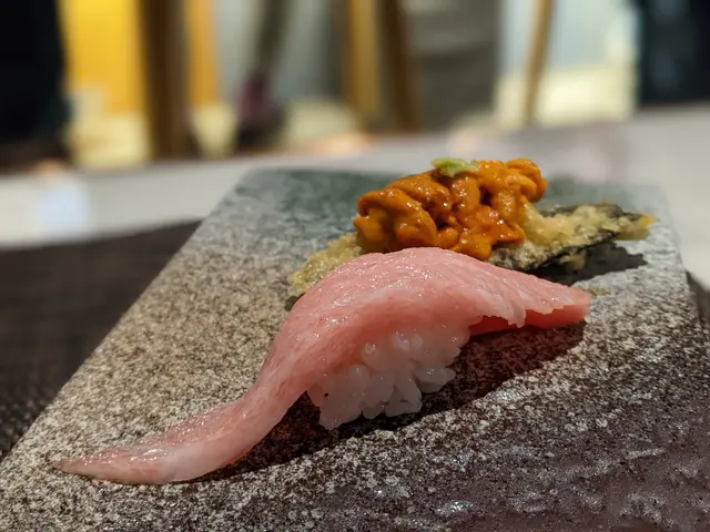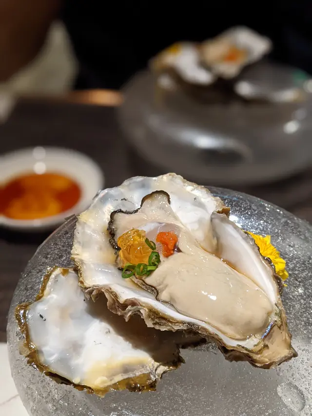 個friend諗住請我食Farewelldinner,我以為會食西餐,點知竟然係日式omakase,好surprise嘢食未到,靚酒先上一嚟就係又貴又靚嘅清酒 梵好飲到嗰種糙米味,仲要用四個細酒瓶用冰鎮方式儲存,令酒能夠保持冰凍酒杯都好靚,有唔同顏色同花紋俾你揀每人一隻肥美生蠔,啖啖肉大拖羅好耐冇食過拖羅,今次仲要係大拖!好肥美,油脂好強烈!食完真係令人好激動,不過真係一件起兩件止,唔能夠食太油嘅嘢海膽炸紫菜天婦羅海膽一啲都唔腥,配埋脆口嘅天婦羅紫菜片,味道好夾左邊既係油甘魚,非常薄片,伴醬油食味道啱啱好,仲有少少菊花片左邊起係花竹蝦,生根子(魚籽),油方煮花竹蝦好爽口,幾厚肉生根子直頭係一粒粒咁痴住,環環相扣,原本個味已經好喊,完全唔需要醬油油方煮賣相唔算好好,但火炙既表面非常香口惹味左邊係一小片既鰤魚,加上少許wasabi,清得黎帶點刺激感赤身吞拿魚中間既小卷,非常薄身,口感嫩滑,一口就可以食左南非機煮鮑魚慢煮左4個鐘既鮑魚,完全冇煙韌既口感加上特有醬料,味道異常濃郁比較主菜既一碟,牡丹蝦,魚子豆腐,同埋尤魚火炙帶子外面輕輕燒焦,加點七味粉,入面仍然keep 到嫩滑口感柚子雪芭咬落果味好重,仲要有少少果肉俾你咬下雪芭口感會比較硬身,但味道就一流…查看更多