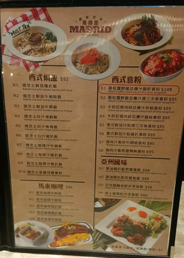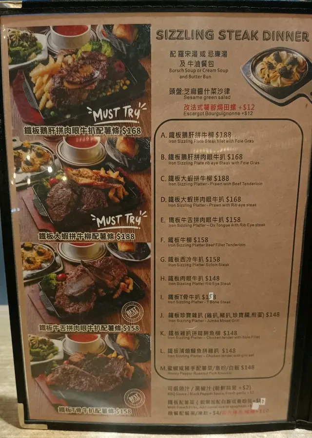 深水埗馬德里餐廳的鐵板餐真係物超所值,全日免收加一服務費,每份鐵板餐都包括餐湯、餐包、沙律、薯菜、餐茶及甜品,夠晒抵食。兩款餐湯各有特色:羅宋湯酸酸甜甜,充滿番茄香氣;忌廉湯則香滑濃郁;配搭牛角包外脆內軟,裡面仲有火腿和芝士,美妙絕倫。頭盤芝麻醬什菜沙律清新開胃,蔬菜爽脆,配上濃香芝麻醬更添風味。主菜選了鐵板肉眼牛扒和鐵板珍寶什扒,肉眼牛扒肉質鮮嫩,配黑椒汁及新鮮蒜蓉更添香氣;珍寶什扒簡直是豐盛之選:珍寶腸彈牙、煎蛋香滑、雞扒嫩滑、豬扒肉味十足,一次滿足多重口味。薯條炸得金黃香脆,加配的意粉份量十足,吸收醬汁後口感更佳。餐茶是凍朱古力濃郁幼滑,凍檸檬茶清新提神,絕對貼心之選。甜品是啫喱配花奶,甜而不膩,為這餐劃上完美句號。總括而言,餐廳的鐵板餐不但食材多元,味道出色,加上價格實惠,抵食又滿足!…查看更多