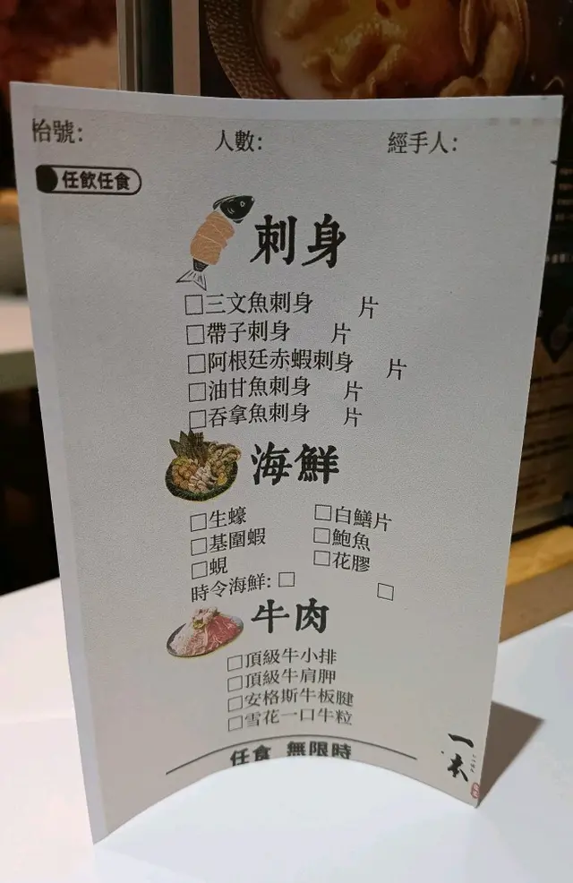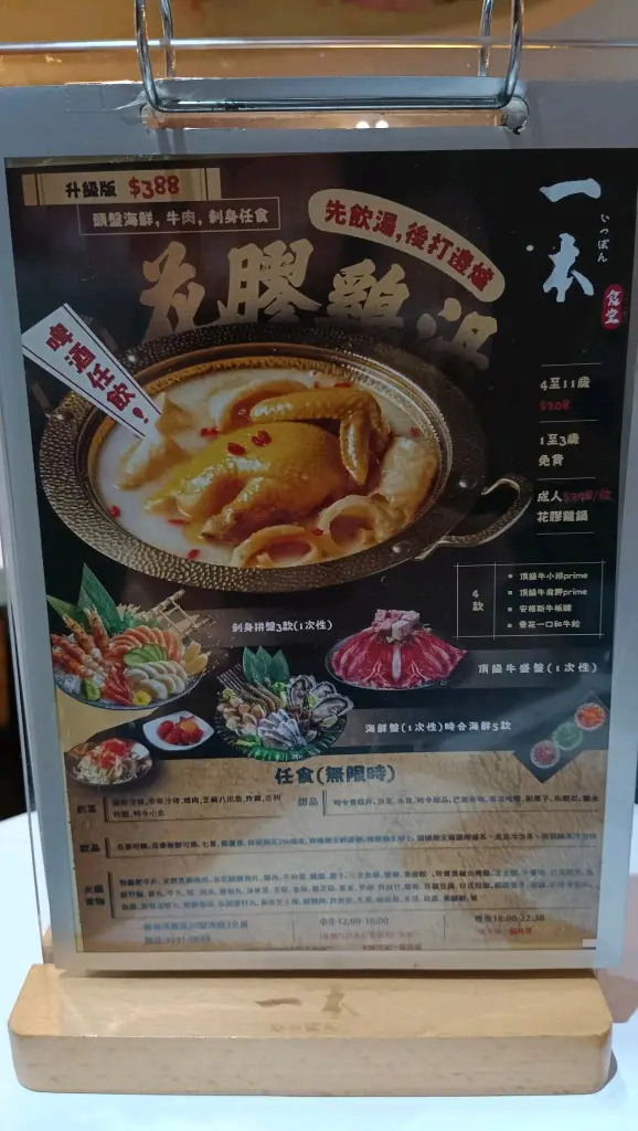 觀塘一本食堂,晚市每位收費$298,即可無限時任食花膠雞鍋,我哋加左$90升級,可無限添加刺身、海鮮和牛,性價比極高。餐廳建議按次序品嚐,確實更能體會食材的層次與鮮味。首先是前菜刺身盤,阿根廷赤蝦巨大隻、三文魚油脂豐富、吞拿魚厚切鮮嫩,帶子味道鮮甜,為整晚打開味蕾。接着是主角花膠雞鍋,湯底不含味精,清甜不膩,花膠滑嫩,雞肉鮮香,令人回味。海鮮盤亦誠意十足,包括鮑魚、生蠔、脆肉鯇魚、大蜆與海蝦,款款新鮮,特別是脆肉鯇魚,口感獨特。頂級牛盛盤則令人驚喜,頂級牛小排與牛肩胛油花分佈均勻,安格斯牛板腱肉味濃郁,和雪花牛粒入口即化,令人欲罷不能。此外,火鍋配料、關東煮、小食及飲品均可任飲任食,選擇多樣,甜品亦無懈可擊。總結,餐廳不但食材優質,服務亦貼心,是火鍋愛好者不可錯過的好去處。…查看更多