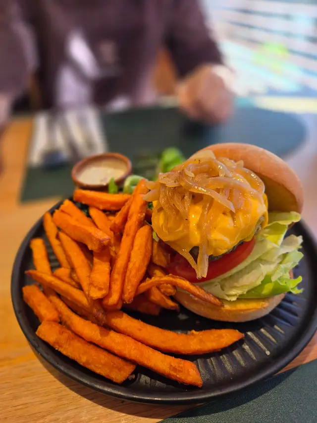 餐廳是溫暖的木質調空間裡。最吸睛的莫過於懸掛在中央的月亮燈飾,柔和的日光灑落。整體的感覺好舒服,瞬間讓人忘卻門外的喧囂。餐廳中午提供 Lunch Manu 。前菜可以選沙律或湯。🔆芝士澳洲和牛漢堡芝士澳洲和牛漢堡肉汁飽滿,濃郁的芝士遇上甜美的焦糖洋蔥,口感層次豐富。搭配的炸甜蕃薯條外酥內軟,可以蘸松露醬。🔆啤酒脆漿炸軟殼蟹喇沙汁意粉啤酒脆漿炸軟殼蟹喇沙汁意粉更是驚艷,酥脆的軟殼蟹帶著少少酒香味。微辛的喇沙醬汁真的不辣。…查看更多