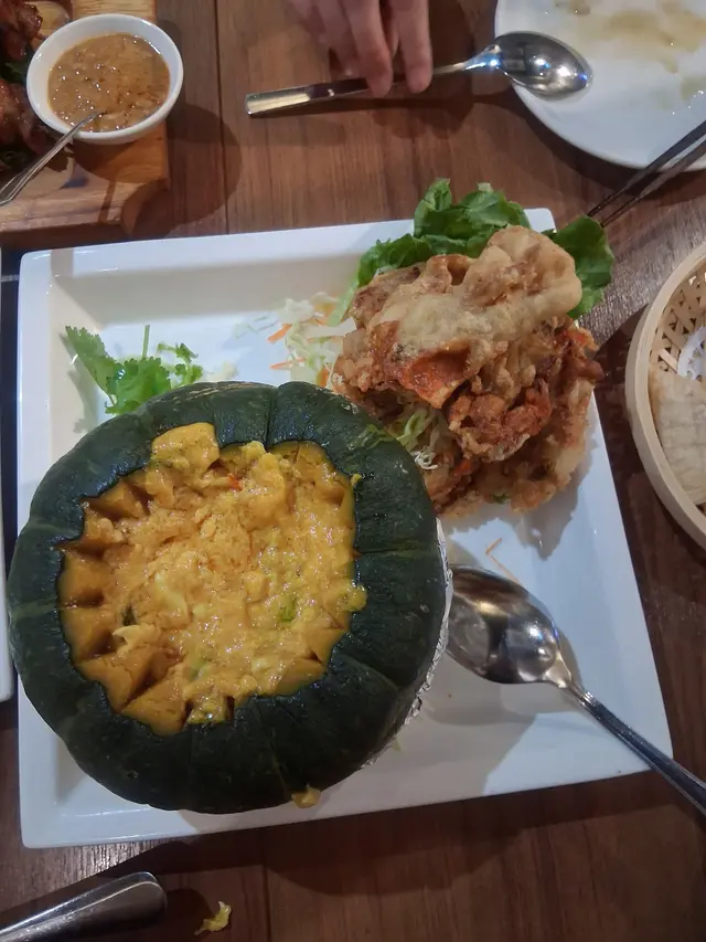 這家在長沙灣青山道的泰國菜,是同事們很推薦的泰國餐廳,平日午市有優惠套餐,並且不用加一,叫了炒河粉,鑊氣十足好吃,泰式奶茶也不會太甜,這樣70蚊覺得很抵。另一次是晚市來食,價錢較午市高了不少,人潮也不像午餐甘多南瓜軟殼蟹黃咖哩: 雖然價錢最貴,但軟殼蟹很多隻,咖哩味道很好,最好吃的是南瓜,最後我們把南瓜都挖的精光!薄餅: 正正常常,配黃咖哩不錯吃,如果不想吃白飯的朋友可以考慮串燒拼盤: 牛、豬、雞各兩串,口感軟嫩,味道也不錯炒菜: 沒甚麼特別,不過餐廳青菜就是有鑊氣這家店最特別是有貓貓,連我對寵物不是特別喜好的,都特登影了幾張相,店員親切,推薦大家…查看更多