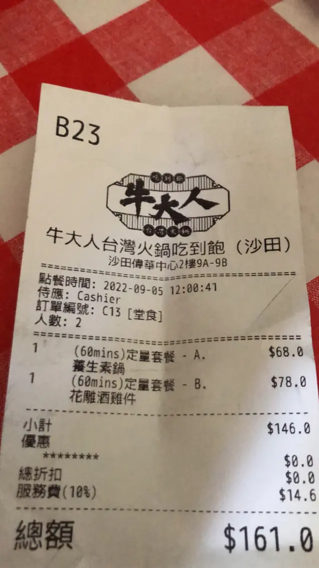 無下次牛大人 牛大人台灣火鍋吃到飽 (偉華中心) 2022-09-05訂咗枱12點, 網上要求提早15分鐘到,11:45已經到沙田牛大人,但為何12點才可以進入?同職員講已經Like 左FB是否有「黑糖珍珠珠鮮奶」送,點知職員話無貨,點解一開市已經無貨,又做網上宣傳,每張枱上也有宣傳,咁嘅手法欺騙消費者點得,結果我哋本來想食貴價的套餐,影響了我們的決定,食平價60分鐘定食,其實90分鐘都係食得好急的,何況60分鐘,坐下等鍋到已經冇咗10分鐘,出去攞嘢加埋放入煲內滾熟都10分鐘,食到最後10分鐘,即12:50職員會叫你埋單,埋完單另一職員又話10分鐘要收枱離開,咁你計下正式食咗幾多分鐘?食得咁大壓力,無下次!…查看更多以上食记乃用户个人意见 , 并不代表OpenRice之观点。1分享無下次牛大人 牛大人台灣火鍋吃到飽 (偉華中心) https://s.openrice.com/QrLT0w1X500检举 ggyy77756 沙田第一次去食 帶老人家去食飯 一個紅色頭髮女服務員說話態度極差 上菜撞到老人家 問候都冇句 不顧而去 咁嘅服務冇下次2022-10-08 回应 张贴 评分2味道2环境2服务2卫生2抵食用餐途径堂食