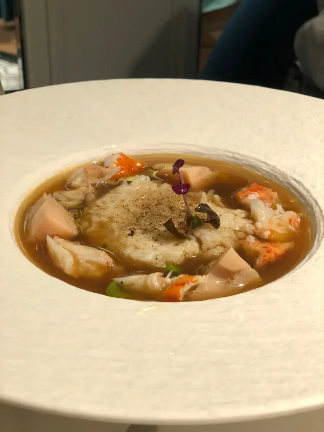 Reign Abalone & Lobster laying in Lobster Consomme served with Rice