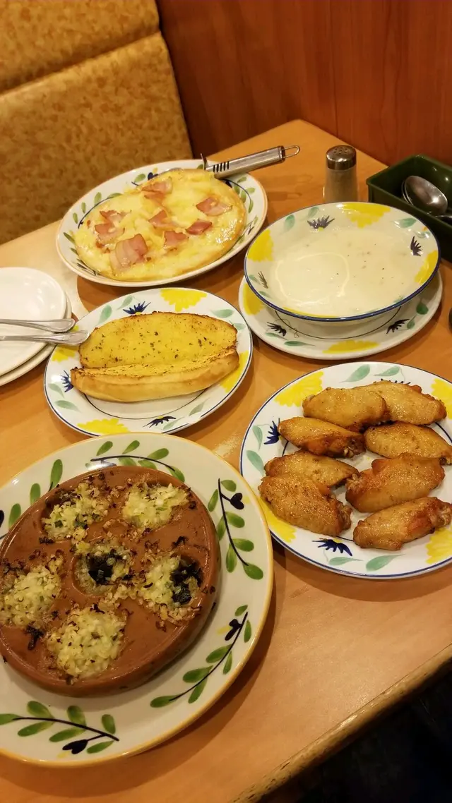 同朋友去新墟睇完戲又唔算太夜,因為第二日要番工所以搵間餐廳坐低食下吹下水就回家.入到餐廳裝修只係普通勝在夠光猛,難得唔洗排隊一於試下你啦.要特別一提唔洗刻意舉手示意落單,桌上有個鐘仔只要按一按會響之餘有個大銀幕彈出枱號就會有待應埋來落單係幾有創意同方便既設計.首先叫左個頭盤,辣味雞翼食落唔算太辣味道適中有點像熱浪味唔知係咪本人愛吃辣接受到個味唔錯.然後再來一個周打海鮮湯,入口第一淡非常重忌廉味道又唔會遮掩左海鮮鮮甜的味道,建議大家可加番少少黑胡椒粒會更加美味唔錯.有湯又點少得個包叫左份芝士法包熱辣辣即焗架推介👍🏼主菜叫番個水牛芝士PIZZA,本人一向係芝士忠粉可以同大家講呢個必試啊,芝士份量夠多夠熱夾得來好夾食落脆卜卜好香口正啊👍🏼最後唔多夠飽加多個小食,蒸蓉焗田螺.味道一般只係夠多蒜蓉牛油幾香但本身田螺唔太鮮甜只係過得去有少少失望😨總括來講食餐意式菜$300有找過得去啦👍🏼…查看更多
