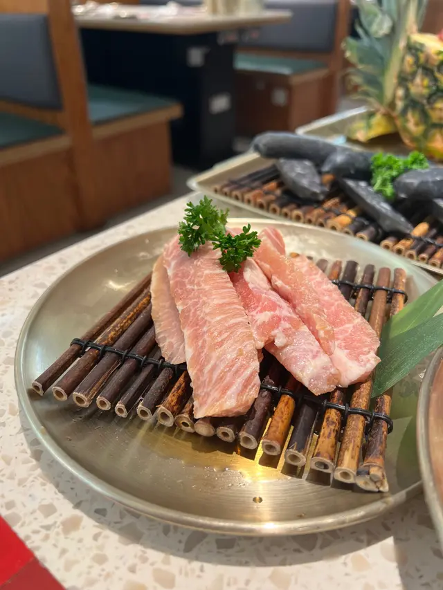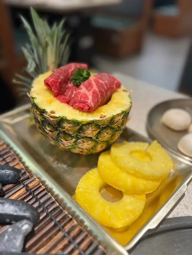 有人經過寶琳地鐵站,出口嘅商場有間燒肉,座位全部都有卡位,二人都坐四人枱,好闊落。店舖內幾光猛,兩旁都有風景畫。二人餐有肥牛,鳳梨牛扒幾大塊,黑色墨魚腸,豬頸肉,蘑菇,海帶湯同甜品。墨魚腸燒吓都幾香口,仲燒到金黃脆脆地。鳳梨牛排真係放喺個菠蘿入面,半個菠蘿上枱,仲有三四塊菠蘿可以慢慢燒。牛排醃得甜甜地幾入味。豬頸肉唔算肥膩,配上生菜🥬,可以食多幾件。海帶湯清清地可以消膩。甜品係一個橙色甜柿嘅樣,食落係糯米包住cream作一個完美總結。…Read More
