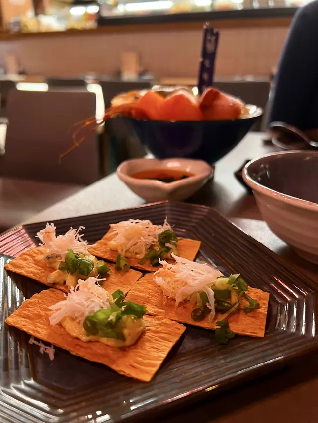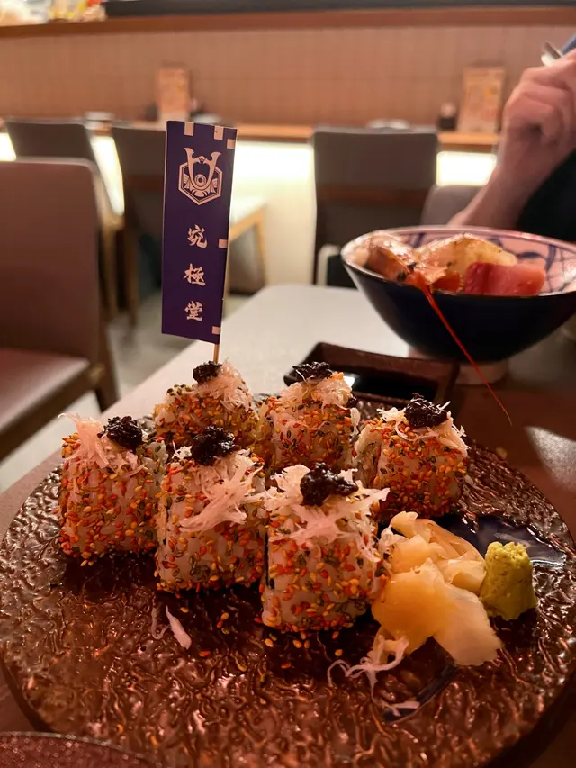 喺銅鑼灣Times Square登龍街,樓上鋪有間日本菜,座位大約三十人。其中有一張長枱型嘅枱,可以自成一個一班朋友聚會。Menu都唔少選擇,包括刺身,壽司,熟食油鹽燒白鱔牛舌,炸物,沖繩生啤酒買一送一。刺身丼飯order咗究極丼,有大牡丹蝦,海膽,厚切帶子,油甘魚同三文魚。油甘魚刺身嘅厚度足足有4 cm。份量都好足夠。卷物係黑松露牛油果軟殼蟹卷,上枱顏色鮮艷,除咗炸軟殼蟹,卷物上面仲有蟹肉絲。小食蟹膏豆腐說魚乾幾有心思,入口鬆化,蟹肉都幾多。…Read More
