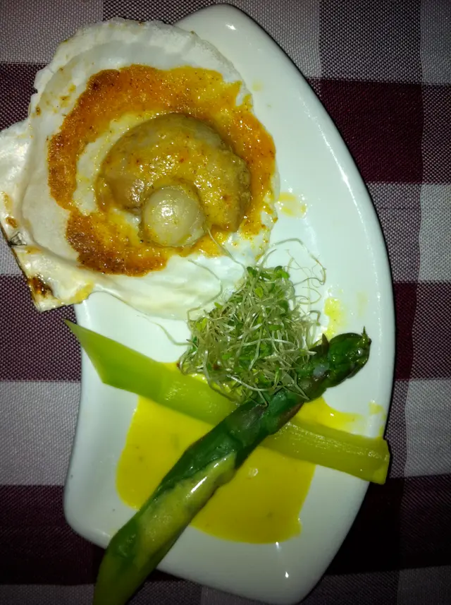 巴黎牛油焗扇貝伴鮮露筍配香檳汁 - 牛油將扇貝焗得好香, 跟露筍配合得非常恰當 !!
