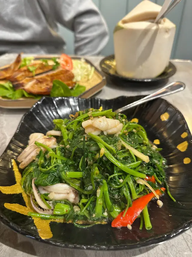 燒豬頸肉肥瘦均勻,燒出油脂香氣,肉汁鎖得住,咬落彈牙juicy蝦醬通菜炒鮮魷足料多魷魚,好香蝦醬味,通菜爽脆,鮮魷新鮮厚實。炸蝦餅外皮炸得酥脆,內裡蝦肉結實彈牙,配上泰式酸辣醬,非常開胃。叫咗兩串沙嗲牛肉串燒,微微焦香,加埋沙嗲醬好夾。呢度嘅乾炒牛河,河粉炒得有鑊氣得黎而且煙煙韌韌,牛肉亦都足料,係性價比之選。上面提到嘅晚市換購優惠,我哋揀咗大頭蝦一份有四隻,大頭蝦食落鮮甜,燒烤火候沒有過火。椰汁雞湯(小),湯頭椰香濃郁,雞肉嫩滑,有火烘住,飲落暖胃。嘢飲叫咗椰青同珍多冰,椰青清甜解膩,珍多冰椰奶濃香。…查看更多