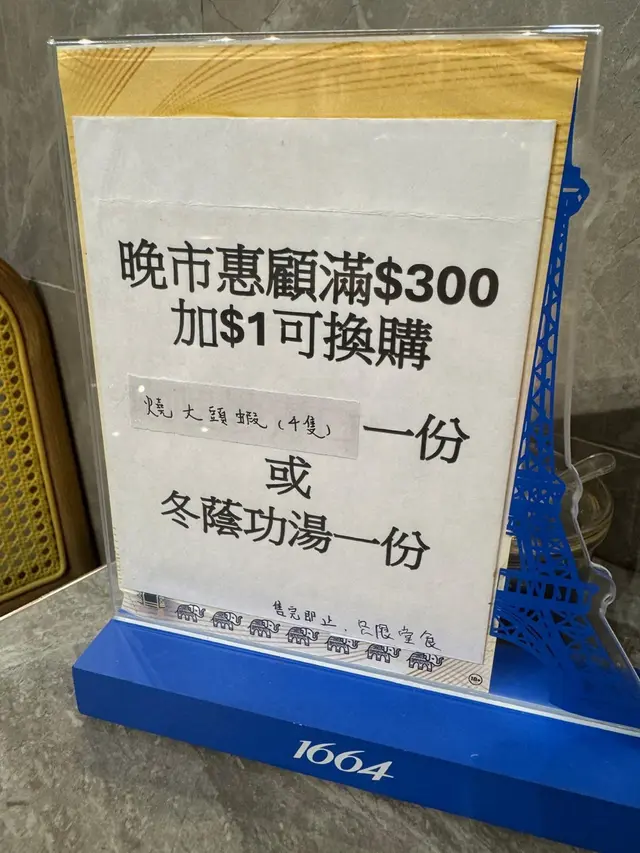 餐廳做緊優惠,晚市惠顧滿$300即可加1蚊換購燒大頭蝦或冬陰功湯一份