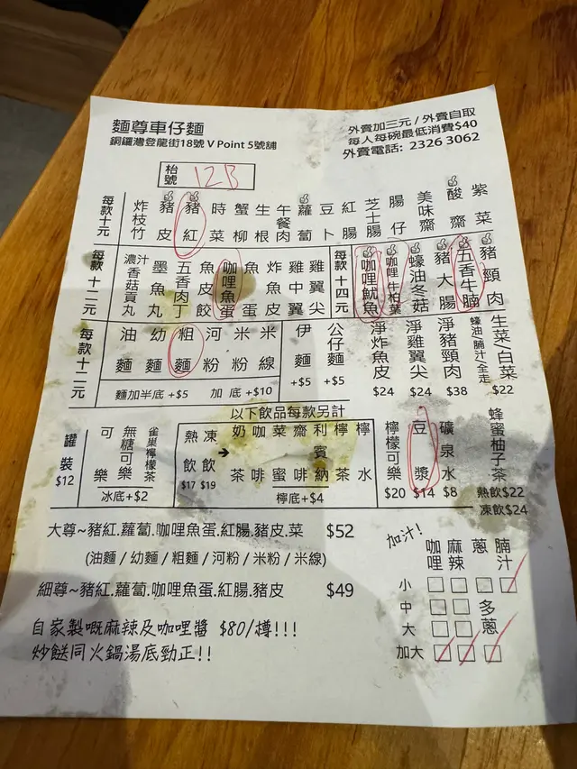 今日又搵嘢食啦,喺銅鑼灣登龍街呢一間車仔麵(麵尊)。叫咗一個五餸嘅車仔麵,豬紅:無血腥味,又咬口亦軟腍,滷得入味,唔會一咬就散,正!咖喱魚蛋:係炸過嘅魚蛋,魚蛋有魚味,但有點未夠彈牙,咖喱唔算好入味,不過不失。咖喱魷魚:土魷,咖喱醬濃郁,不是醃製度變晒色嗰隻,新鮮,應該要有嘅都比到。咖喱牛柏葉:咖喱醬濃郁,完全可以滲入牛柏葉內,爽口彈牙。五香牛腩:不是以往的牛腩,夾起嘅時候比較長身,紋路奚落有點不似牛腩,但鬆軟,有口咁,算係唔錯。粗麵:爽口冇鹼水味,掂。湯低:清湯但濃郁,今次有啲貪心,味道上我揀咗,腩汁,咖喱汁,麻辣汁,綜合起所有味道都唔錯,係有一定嘅吸引到嘅車仔麵,正。但食完之後係有啲口渴嘅。…查看更多